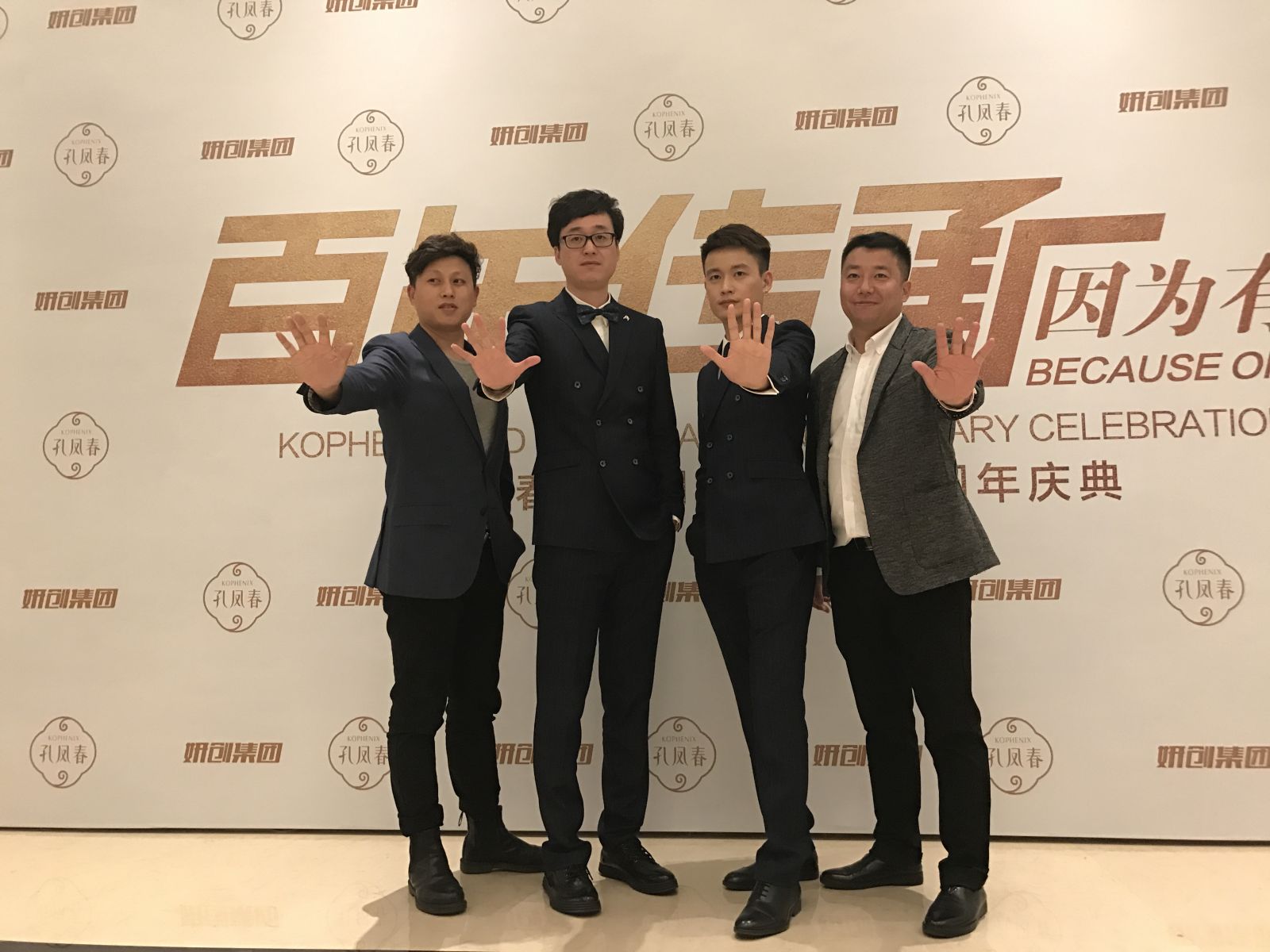 創(chuàng)始人與伍方負(fù)責(zé)人合照,共同擺出伍方經(jīng)典手勢