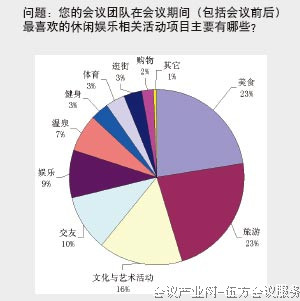 杭州伍方會議服務有限公司非常支持中國會議產業(yè)網(wǎng)對這次活動調查--2012會議代表最喜歡的休閑娛樂等活動項目調查 隨著我國會議市場的快速發(fā)展,我國會議需求市場正在發(fā)生一系列前所未有的變化,而這種變化必然會快速傳遞于下游市場,比如會議中心與會議酒店、會議公司、會議城市等。國際會議產業(yè)發(fā)展的最新趨勢表明,會議代表的需求正在經歷兩個方面的變化,一是對于會議的核心需求要求越來越高,包括會議策劃、會議組織與服務、會議場地、餐飲、住宿等;另一方面對于會議附加活動的豐富程度及其實施效果給予了更高的希望。為了深入了解我國會議代表對于會議附加活動需求的變化情況,本刊近期對于北京和上海的50家會議組織機構、會議公司有關負責人進行了一次市場調查活動?!?nbsp;